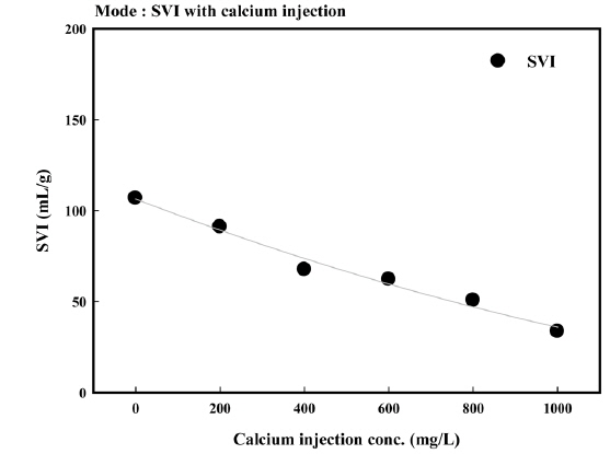 SVI 값은 각각 106.9, 91.1, 67.6, 62.2, 50.7 및 33.6 mL/g으로 나타나 칼슘이온의 주입량이 증가할수록 SVI 값은
