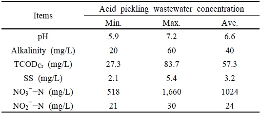 주입· 반응시켜 탈질 미생물을 배양하였다. Table 1에는 E사의 산세공정 1차 처리수의 성상을 나타냈다.