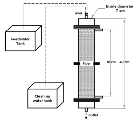 본 실험 장치는 실험실규모의 여과장치로 Fig. 1과 같이 여과부, 유입탱크, 세척탱크로 구성되어있다. 여과부는 투명아크릴로 지름 7 cm, 높이 40 cm의 규모로 제작하였다. 상· 하부에는 유입과