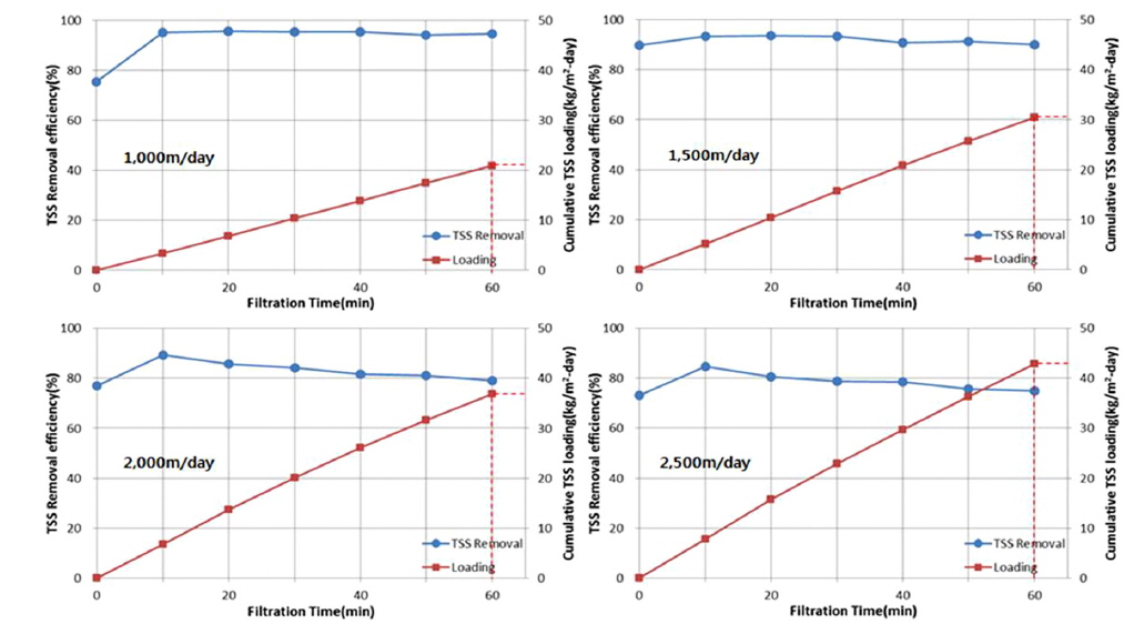 섬유필터 연구를 수행한 Kim et al. (2014)의 연구결과와 비교하였을 경우에도 고속여과속도(본 연구 1,500 m/day, 비교연구 1,180 m/day)에서 20% 정도의 우수한 효율을 보였다.