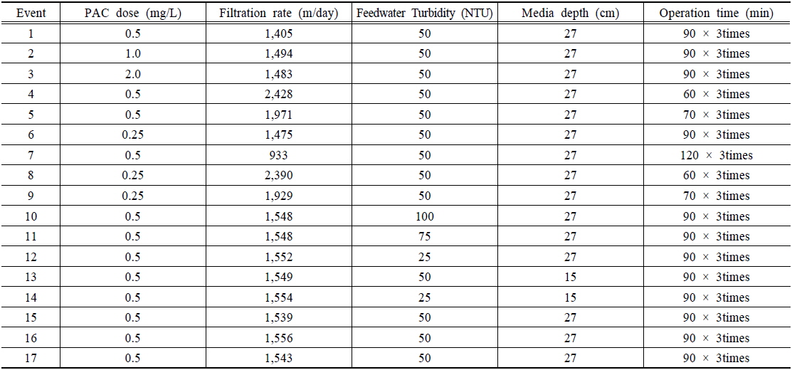 유입수 탁도 및 여과속도 조건에서(50NTU, 1,500 m/day) 0.25 ~ 2.0 mg/L의 주입농도로 운전하였다. 또한 여과속도, 유입수