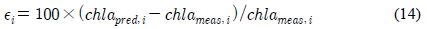 모형을 통해 추정한 Chl-a 농도와 실측한 Chl-a 농도의 상대오차 비교를 통해 각 모형의 정확도를 평가했다. 또한 모형의 계통오차(systematic