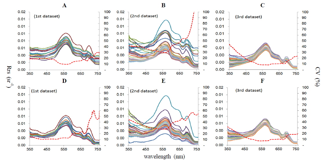 계산된 at-w(λ) 스펙트럼들에서 뚜렷한 흡수 피크가 관찰되지 않고 적층된 형태를 보여 Chl-a와 CDOM의 영향을 동시에 받고 있었던 것으로