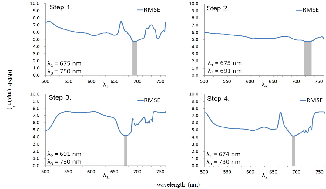 모형을 이용해 추정한 Chl-a 농도와 실측한 결과값을 비교하여 400 nm에서 800 nm 파장대 구간에서 반복계산을 통해 1 nm 간격으로 RMSE를