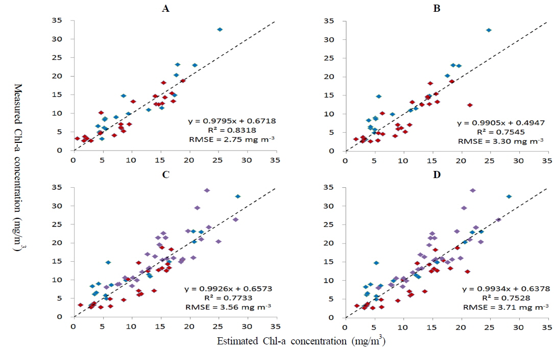 3-band(665 nm, 708 nm, 753 nm)를 이용한 방법(D)의 RMSE가 2.79 mg/m3으로 가장 낮았고, 전반적으로 결정계수가 0.84에서 0.87로 실측된 Chl-a 농도를 잘 재현하였다. 보통 Chl-a 농도가 낮은 경우에는 상대적으로