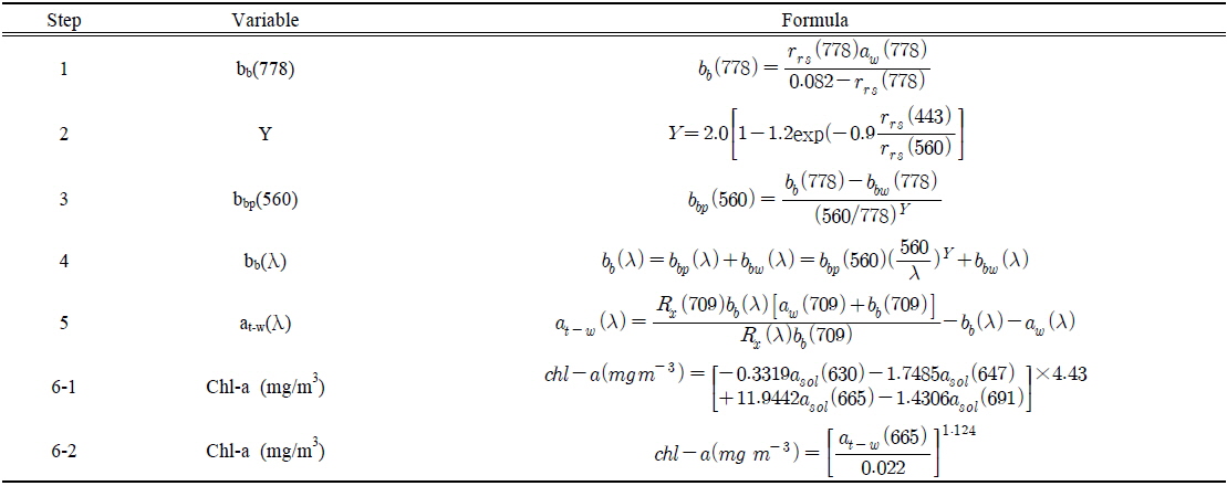 Chl-a이나 CDOM, NAP에 의한 흡수가 매우 작고 대부분 물에 의해 흡수가 일어나는 700nm 이후 파장대를 이용해 후방산란계수를 산정하였다(Gons, 1999; Gons et al., 2002; Gons et al., 2005; Gould et al., 2001; Le et al., 2009; Simis et al., 2005; Simis et al., 2007). 전체 파장대에 대한 후방산란계수와 입자성물질에 의한 산란계수는 표 1의 3~4 단계를 통해 산정 가능하다(Lee and Carder, 2004; Lee et al., 2002; Lee et al., 2009). bbw(λ)는 순수한 물에 의한 후방산란계수이고, Y는 입자성물질에 의한 후방산란계수를 산정하 기 위한 상수로 443 nm와 560 nm 파장에서