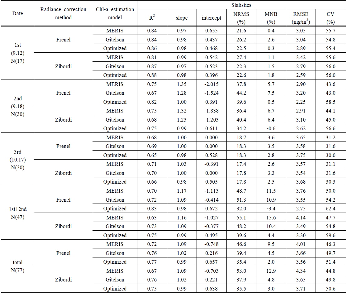 0.65에서 0.88까지 변화를 보였고 RMSE는 2.25 mg/m3에서 4.34 mg/m3까지 값을 보여 전반적으로 실측된 Chl-a 농도와 비슷한 추정결과를 보였다. 또한, 1차, 2차, 3차 및 전체 측정자료에 적용된 각각의 Chl-a