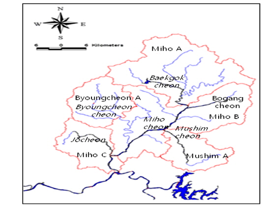 Table 7에서 보는 바와 같이 WARMF 모델상에서는 집수구역에 따라 자동으로 catchment 가 구분되며, 유량이나 수질 실측지점, 즉 모델의 보정 포인트를