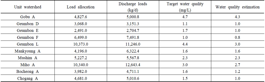 정하고, 수치모델링을 통하여 만족하는 배출부하량에 안전율(10%)을 차감하여 할당하였다.