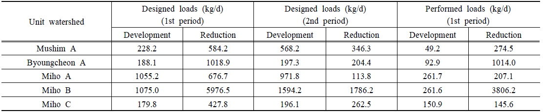 1단계 할당방법에 따라 부하량이 할당된 미호천을 중심으로 1단계 개발계획 및 삭감계획 부하량과 실제 이행된 부하량을 비교한 결과, 미호A와 미호B는