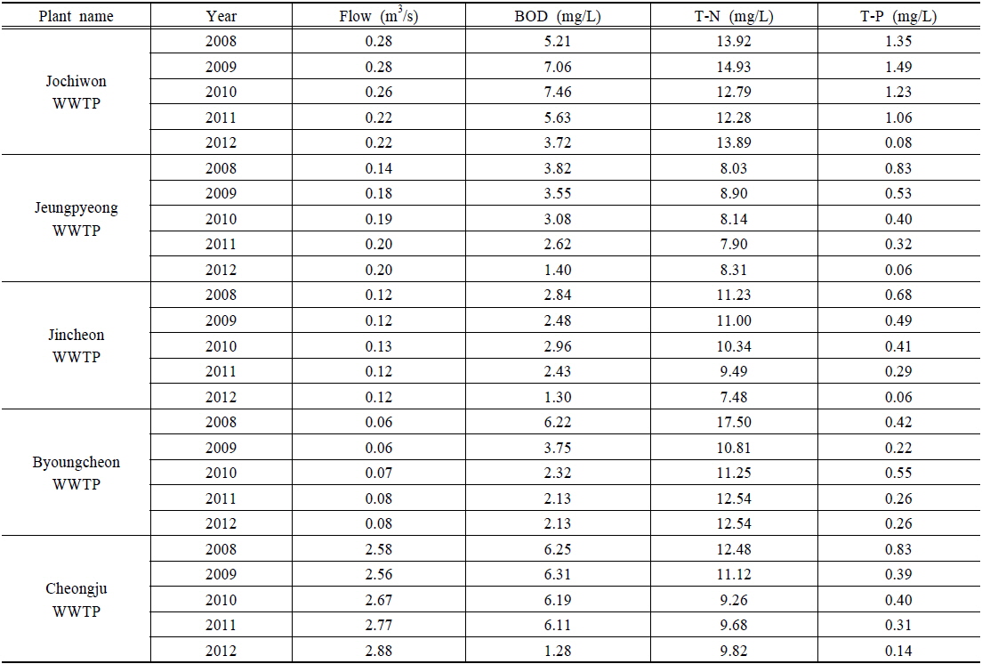 미호천유역 내에 위치한 병천하수처리장, 조치원하수처리장, 증평하수처리장, 진천하수처리장, 청주하수처리장 등의 수질 및 유량 일 자료를 점오염원 입력
