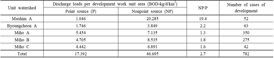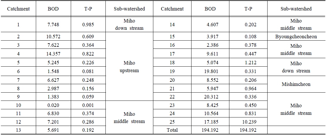 미호천유역 내 오염원에서 배출되는 오염원배출부하량은 단위면적당 부하량으로 환산하여 입력 파일을 구성하였다(Table 7).