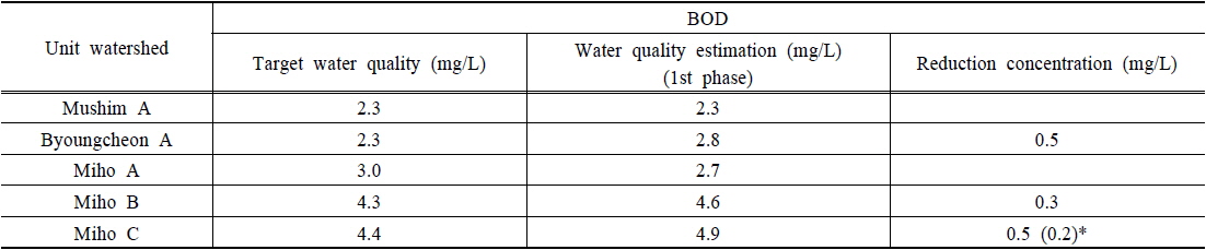목표수질 2.3 mg/L를 달성하기 위해서는 0.5 mg/L이상의 수질개선이 가능한 배출부하량삭감이 이루어져야 하며, 미호 B와 C의 경우 목표수질