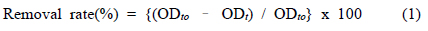 DU 730)๋ฅผ ์ด์ฉํ์ฌ ๊ด ๋ฐ๋๋ฅผ ์ธก์ ํ์๋ค(APHA, 2012). ๋ฏธ์ธ์กฐ๋ฅ ๋ถ๋ฆฌํจ์จ์ ์๋์ ๊ฐ์ด ๊ณ์ฐํ์๋ค.
