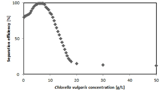 Separation efficiency by different microalgae concentration (Mg/Si mol ratio: 1.5,