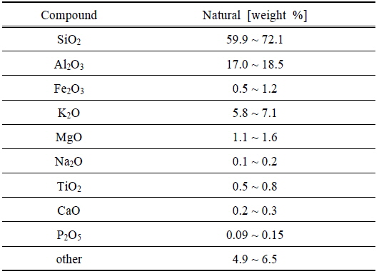 Sericite์ ํจ์ ๋์ด ์๋ ๋ฌด๊ธฐ ์ฑ๋ถ์ ์ง์ ์์ ๋ถ์์ X-ray fluorescence(XRF-1500, Shimadzu, Japan)์