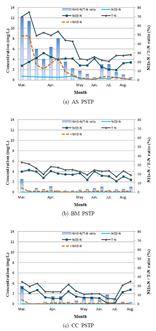 있어 NOD (질소화합물의 산화 분해에 의한 산소 소모, nitrogenous oxygen demand)가 발생할 가능성이 크다. 따라서 NH3-N가 높은 농도로 존재할 경우 방류수의 BOD 기준을 초과할 우려가 있으며 이는 수용하천에도 영향을 미친다(Min et al., 2011).