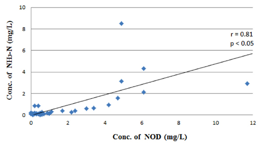 17%로 조사되었다. Fig. 1~2 와 같이 BOD와 NOD의 농도변화는 비슷한 양상을 나타냈으며 NOD 발생과 관련하여 방류수 내 NH3-N 농도와의 상관성을 Fig. 3과 같이 확인할 수 있었다. (r=0.81, p<0.05)