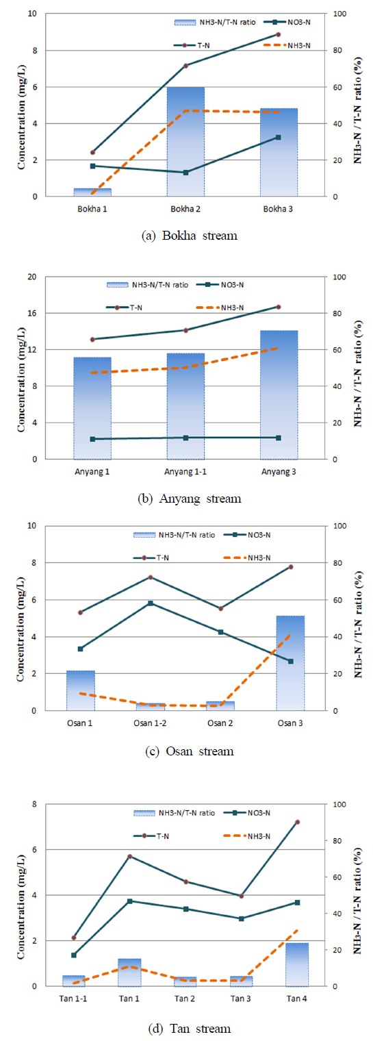 농도상승이 나타났으며 특히 무기질소 중 NH3-N (암모니아성 질소)가 높은 농도를 보이면서 하천 수질에 영향을 주는 것으로 나타났다(Shin et al., 2000; Sung et al., 2010).