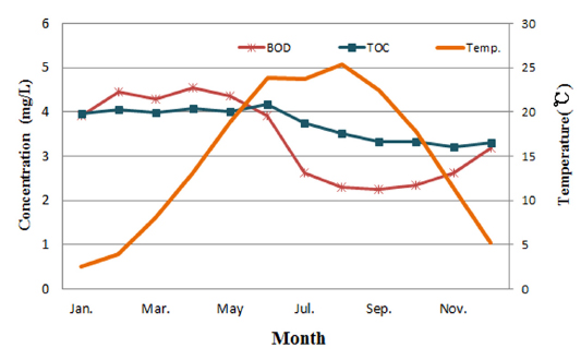이와 관련하여 하수처리시설의 TOC의 병행 적용 방안이 연구(Byun et al., 2010; Jeong et al., 2014)되고 있으며 하천수질과의 연계성있는 난분해성 유기물질 평가를 위해서 공공하수처리시설 방류수의 TOC 농도를 조사할 필요성이 제기되고 있다.