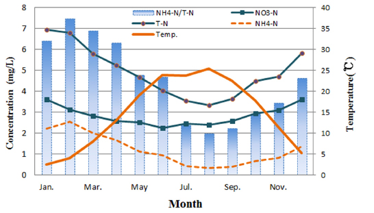 오염원 유입이 일어난다면 하천에서의 NH3-N 농도가 높게 유지될 수 있다. NH3-N의 취기한계는 0.04mg/L로 악취를 유발하고 pH에 따라 어류 독성을 나타낸다(Han and Seh, 1986; Park, 2010). 또한 남조류의 동화작용시 다른 무기질소화합물보다 선택성이 높은 것으로 보고되고 있다(Maeng, 1982). 질소화합물의 산화 과정에서 산소 소모로 인해 DO농도에 영향을 준다. 특히 생물학적 수처리를 통한 하수처리시설의 방류수에는 질산화균이 다량 포함되어
