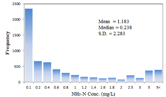 NH3-N는 pH에 따라 NH3, NH4+ 형태로 나타나는데 자연수계에서는 대부분 NH4+ 형태로 존재하고 있으며 수중 초기오염물질 유입의 지표인자로 이용된다. 자정능력이 탁월한 하천의 경우, NH3-N의 유입 이후 물리적, 화학적, 생물학적인 자정작용에 의해 질산성 질소로 산화되거나 생물체로 동화되어 그 농도가 낮아지지만 지속적으로 오폐수 등