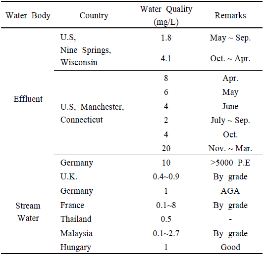 Table 1과 같이 NH3-N의 방류수 수질 기준 및 하천 수질 기준을 설정하여 관리하고 있다(MOE, 2010; NIER, 2000).