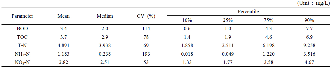 백분위수(Percentile, 10%, 25%, 75%, 90%)를 구하여 하천에서의 물질별 농도 분포를 파악하였다.