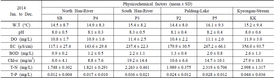 (P3), Paldang-Lake (P2, P5) and Kyeongan-Stream (KK), 2014