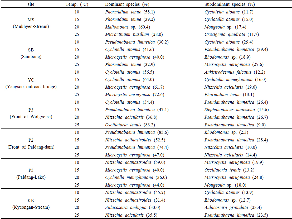 전 지점의 주요 출현종은 Phormidium tenue, Pseudanabaena limnetica, Oscillatoria tenuis, Microcyctis aeruginosa, Cyclotella atomus, Nitzschia actinastroides, Aulacoseira ambigua 등으로 대부분 남조류와 규조류였으며, 녹조류는 출현빈도가 낮았다. 북한강의 묵현천(MS)은 10~15℃의 배양조건에서 사상성 남조류인 Phormidium tenue가 39.2~58.1%의 범위로 우점 하였으며, 규조류인 Cyclotella atomus가 11.7~15.0%로 아우점종으로 출현하였다. 20℃ 조건에서는 황색편모조류의 Mallomonas sp.가 25℃ 조건에서는 녹조류인 Micractinium pusillum이 우점종으로 출현하였다(Table 3). MS의 현존량은 모든 조건에서 3.5×103 cells/mL 이하로 낮았으며, 수온이 높을수록 녹조류의 현존량이 높았다. 삼봉리(SB) 지점은 10~15℃의 배양조건에서 Pseudanabaena limnetica과 Cyclotella atomus가 29.4~41.6%의 범위로 우점종 및 아우점 종으로 출현한 것으로 MS 지점과 유사하였다. 20℃ 조건에서 유해남조류인 Microcystis aeruginosa가 40.0%로 우점 하였으나, 현존량이 1.0×103 cells/mL 이하로 높지 않았다. 25℃ 조건의 경우 남조류가 전체 출현종의 79.9%로 높은 우점율을 나타냈으며, 사상성 남조류인 Phormidium tenue가 8.5×103 cells/mL, Microcystis aeruginosa가 7.1×103 cells/mL로 모든 지점과 온도조건에서 남조류 현존량이 가장 높았다(Table 3)(Fig. 2).