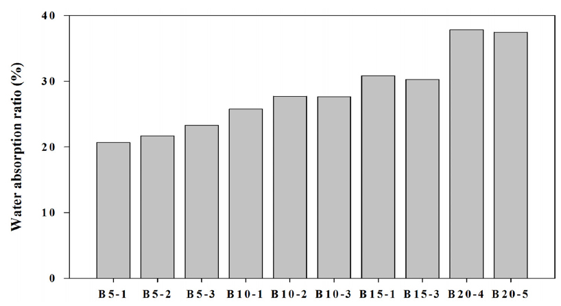 B20-4로서 37.84%의 흡수율을 보였으며, 가장 낮은 흡수율을 보인 투수블록은 B5-1로서 20.68%의 흡수율을 보였다. 그러나 앞의 압축강도