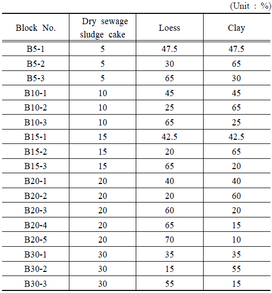 투수블록 제조를 위하여 건조 하수오니 케익과 황토 및 점토를 혼합하여 블록을 제조하였으며, 이때 사용된 혼합비는 Table 1에 나타내어 놓았다. 각 재료의 혼합비율 조건에 따라 재료를 혼합 용기에 넣은 후 10~15 wt.%의 물을 가하여 완전히 혼합되도록 반죽하였다.