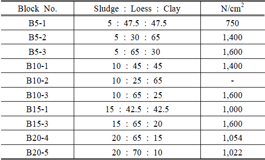 건조오니 함량을 5~20%로 변화 시켜가며, 최적 혼합비 결정 실험을 실시한 결과 압축강도 측면에서는 오니 : 황토 : 점토의 비가 5 : 65 :