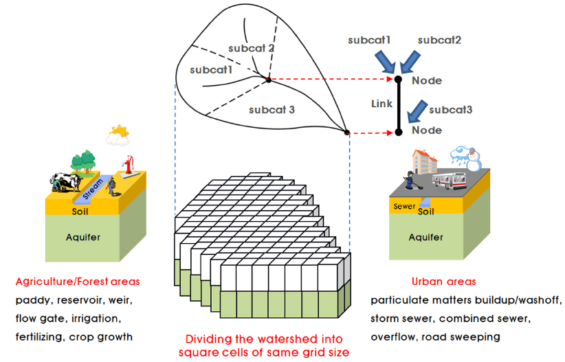 지닌다. 그 대표적 예로는 우리나라의 전형적인 농업지역과 도시지역에서 발생하는 특정 수문현상(논의 물꼬 조작, 우하수관로 차집 및 월류 등)을 동시에