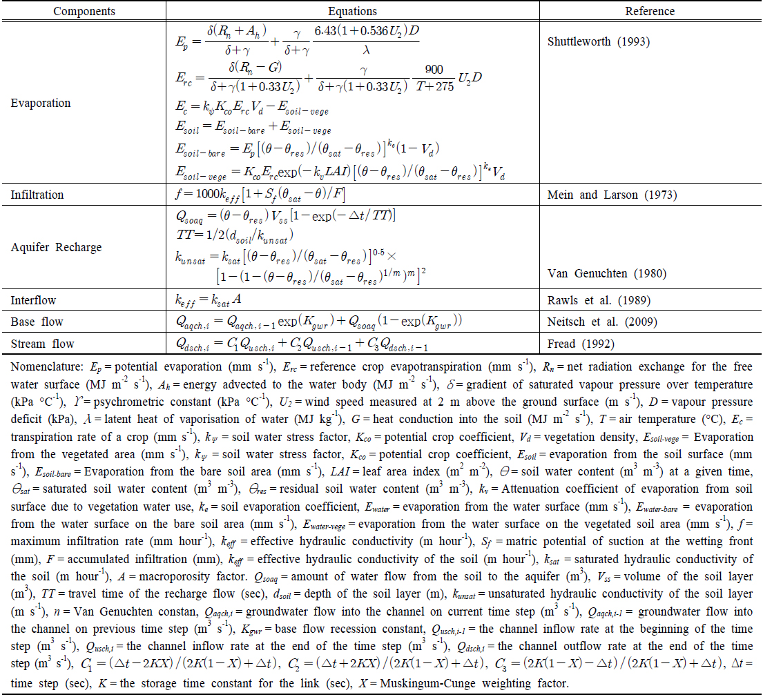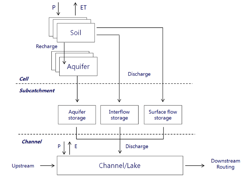 지하수 충전, 지표면 유출, 중간류 유출, 지하수 유출 등으로 구성된다. 소유역의 수문과정은 지표수, 중간류, 지하수의 3개 저장소를 이용하여 표현된다.