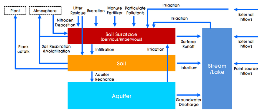 • 토양/지표수/지하수 중의 탄소, 질소, 인 변환과정과 이동을 모의한다.
