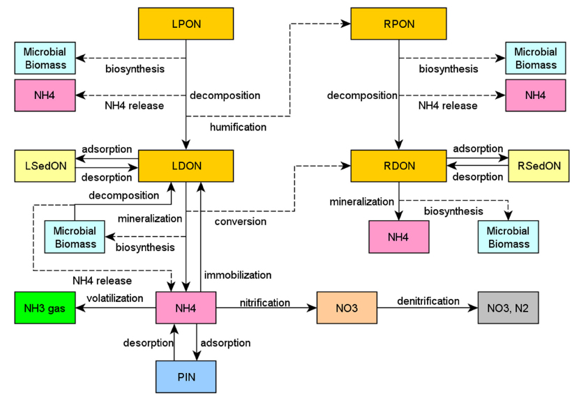 이용되며, 일부는 호흡작용으로 인해 CO2의 형태로 변환되어 대기 중으로 이동한다. 입자상 유기물 중 LPOM은 부식화 과정을 통해 난분해성 물질인 RPOM로 변환한다. Fig. 5는 STREAM에서의 질소순환과정을 도식화한 것이다. 식생에 의한 흡수와 암모니아 휘발, 질산화, 탈질화 등의 과정은 1차 방정식으로 표현되며, 이