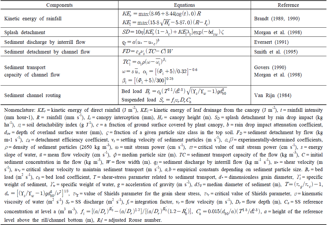 • 지표수 유동에 의한 토양에서의 유사의 이동을 입도에 따라 clay, silt, fine sand 및 coarse sand 등으로 구분하여 모의한다.