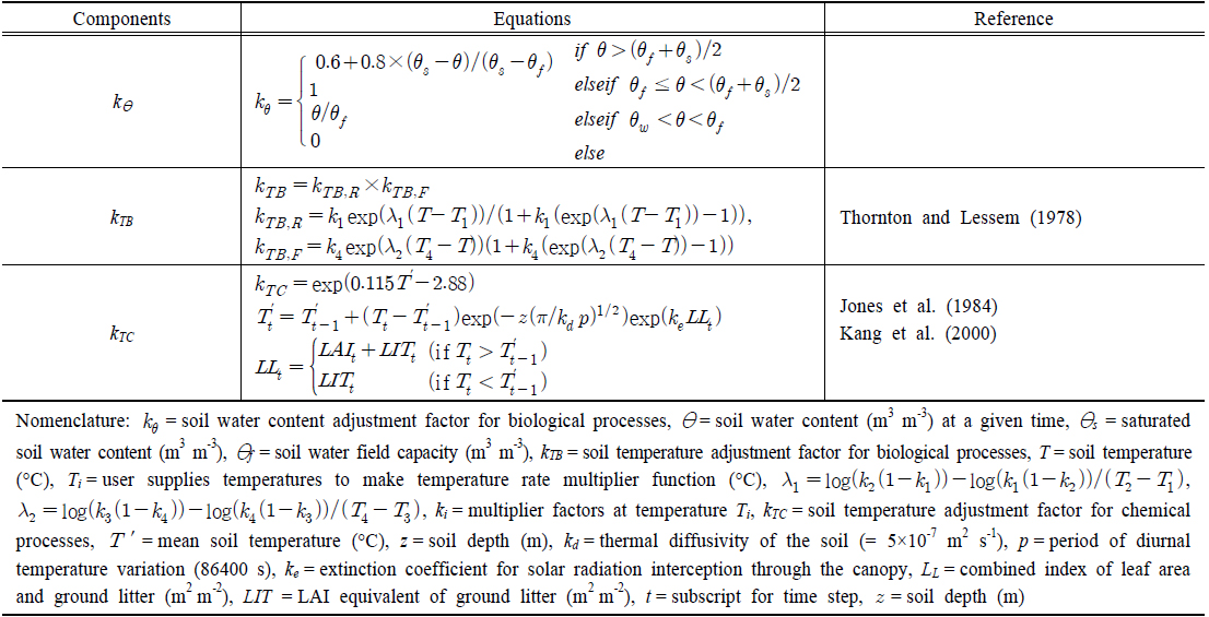 STREAM은 토양 중 탄소, 질소, 인의 변환과정에 영향을 미치는 주요 요인으로 토양 수분과 토양 온도를 명시적으로 고려한다(Table 6). 토양수분조정계수(kθ)는 현재의 토양 수분(θ)과 토성별로 부여된 wilting point (θw), field capacity(θf), saturated water content (θs)를 비교하여 산정된다. 토양온도는 미생물의 활동과 화학 반응에 영향을 미치는 요인으로 작용한다. 생물학적 반응에 대한 토양온도조정계수(kTB)는 Thornton and Lessem (1978)이 제안한 식에 따르며, 화학반응에 대한 토양온도조정계수(kTS)는 Jones et al. (1984)에 제안한 식을 따른다. kTB, kTC에 포함된 토양온도는 식생의 엽면적지수와 토양 표층의 낙엽을 고려하여 산정된다(Kang et al., 2000). 수체의 경우 수분이 포화된 상태로 수분에 따른 조정계수 값으로 1을 사용하며, 온도 조정계수는 수체온도를 이용하여 토양과 동일하게 Jones et al. (1984)에 제안한 식을 이용하여 산정한다. 수체온도는 대기온도를 이용하여 Stefan and Preud'homme (1993)이 제시한 식(Twater = 5.0 + 0.75 × Tair)에 의해 산정한다.