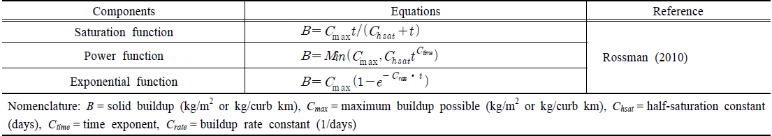 반영하였다. 도시 지역에서 입자성 오염물질의 축적 과정은 무강우 일수에 대한 비선형적 시간함수로 표현되는데, 일반적으로 saturation function,
