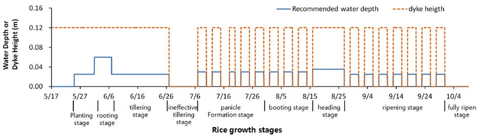 Recommended ponding water depth and dyke height for different growth stages of rice