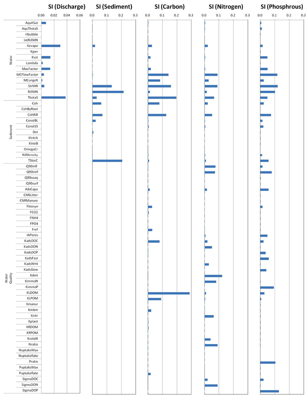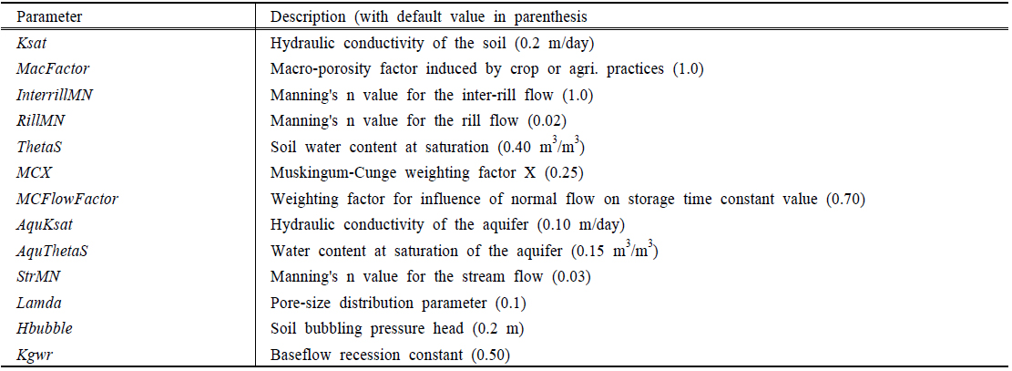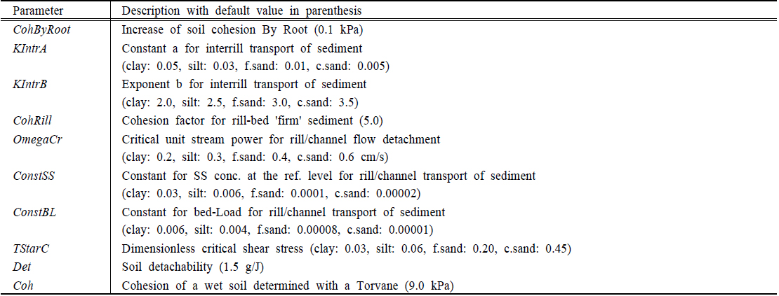 수 있다. 먼저 면상침식 및 이동과 관련된 매개변수로 단위 강우에너지에 의한 유사분리량 Det, 습윤 토양에서의 점착성 증가 Cho, 지표수의 유사운반능력에 대한 단위 수류력(unit stream power) 임계치 omegaCr, Everaert (1991)이 제안한 지표수에 의한 유사이동 경험공식의 KIntrA, KIntrB 등을 선정하였다. 릴과 하천에서의 유사침식과 이동에 대해서는 릴의 토양 점착성 CohRill, 식생에 의한 토양 점착성 증가 cohByRoot, Van Rijn (1984)이 제시한 부유사, 소류사 이동과 관련된 참조 높이에서의 부유사 농도 ConstSS와 소류사 농도 ConstBL, Shields diagram의 무차원 전단응력 TStarC 등을 선정하였다. 영양물질 변환 및 이동과 관련해서는 미생물 생체량의 CNP 비율을 나타내는 CNPratio, 유기물 생분해 과정에서 항목별 변화율을 나타내는 Fbiosyn, Fref, FCO2, FNH4, FPO4, 유기물의 분해속도상수를 나타내는 Kplant, Kmanur, KLPOM, KRPOM, KLDOM, KRDOM, Kmbm을 선정하였다. 질소 변환과 관련하여 KimmoN, KvolaN, Knitr, Kdnit 등의 속도상수, 인의 변환과 관련해서는 부동화 속도상수 KimmoP을 선정하였다. CNP의 유사 흡착과 관련해서는 KadsDOC, KadsDON, KadsNH4, KadsDOP, KadsFast, KadsSlow, SigmaDOC, SigmaDON, SigmaDOP를 선정하였다. 낙엽과 퇴비의 CN 비율을 나타내는 CNRLitter, CNRManure, 식생의 양분섭취와 관련된 NuptakeRate, NuptakeMax, PuptakeRate, PuptakeMax, 유사의 CNP 흡착능력을 나타내는 AdsCapacity, 물의 이동에 따른 CNP 이동 능력을 나타내는 Q90surfP, Q90infl, Q90intf, Q90soaq, IAPores 등의 매개변수를 선정하였다.