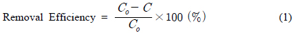 여기서, Co는 유입수 농도, C는 유출수 농도이다.
