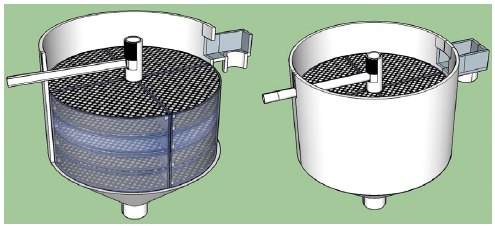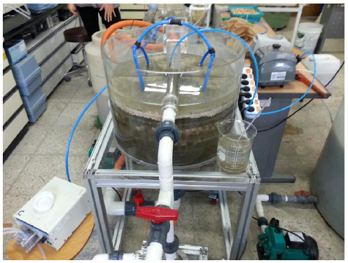 용적은 0.20 L이다. 여과조는 전체 용적과 높이는 각각 60.36 L, 600 mm이다. 유입수는 상단에서 유입하여 중앙 유입관을 통하여 하부