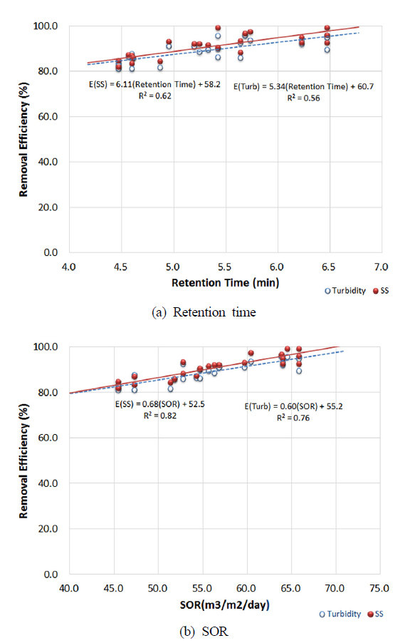 Table 2에 제시된 SOR을 45.5~65.9 m3/m2/day, 여과조 체류시간을 4.5~6.5 min의 조건에서 추가적으로 운전한 결과를 정리하여 Fig. 6에 제거효율과의 관계를 도식하였다. 체류시간이 증가하면 SS와 탁도 제거효율이 상승하는 경향을 나타내는데 상관계수 R2는 각각 0.82, 0.76으로 분석되었다. SOR과 SS, 탁도 제거효율과의 상관계수는 각각 0.62, 0.56으로 SOR증가에 따라 처리효율은