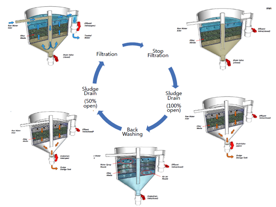여과조에 고형물질 부하를 최소화할 수 있는 기술을 개발하고, 여과조 배수밸브 조작모드와 공기와 물을 이용하여 역세척을 실시하고 물질수지를 적용하여