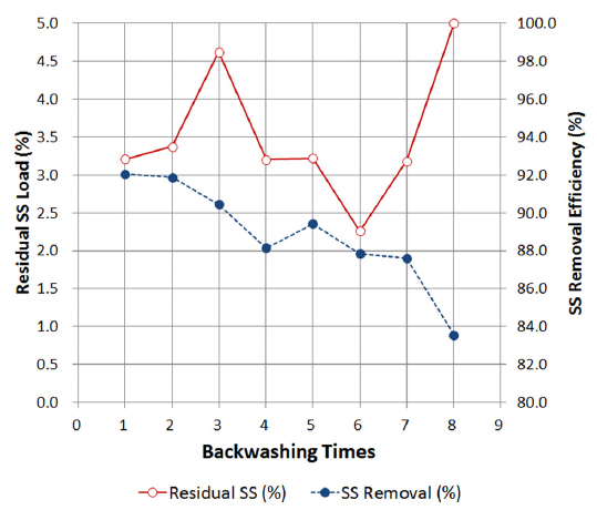 분석되었다. 역세척 횟수별로 탁도와 SS 제거효율을 분석한 결과 탁도 89.5%, SS 91.4%로 역세척 효과를 나타내었다.