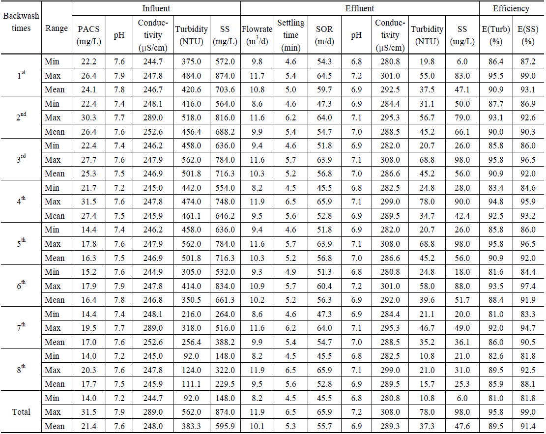 m3/day (평균 10.1 m3/day), 여과지 수면적 부하율을 기준한 SOR은 45.5~65.9 m3/m2/day (평균 55.7 m3/m2/day), PACS 주입농도는 14.0~31.5 mg/L로 운전하였다. 탁도 제거효율은 81.0~95.8% (평균 89.5%), SS 제거효율은