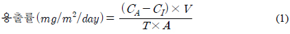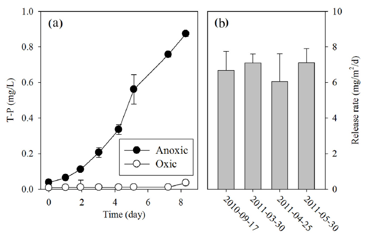 퇴적물로부터 총인의 용출률은 다음과 같은 식으로부터 산출되었다. 식에서 CI는 총인의 초기 농도이며, CA는 총인의 나중 농도이다. V는 반응조 내 상등수의 용량(L)이며, T는 용출 시간(day), A는 반응조의 면적(m2)이다.