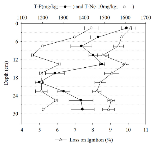 따른 총인과 총질소의 농도는 유기물의 농도와 같은 경향을 나타내었다(Spearman Rank Correlation, p<0.05). 퇴적물의 깊이에